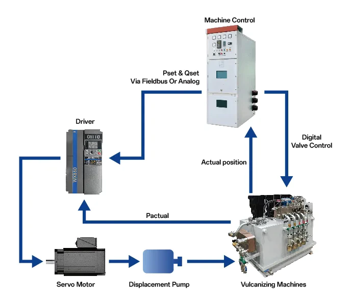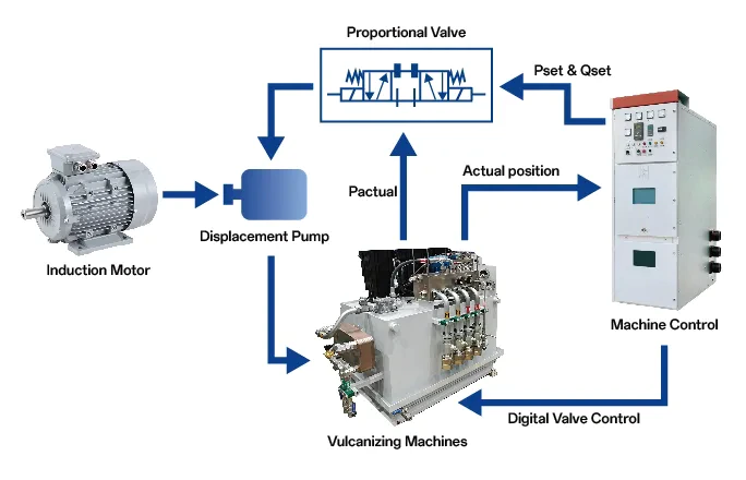 Traditional tire vulcanizing machines often employ valve-controlled hydraulic systems, typically driven by standard asynchronous motors paired with fixed-displacement pumps. In this configuration, the equipment often operates at a fixed speed, resulting in significant energy consumption. Additionally, the rotation of components generates friction and heat within the pump, which accelerates equipment wear, shortens its service life, and is accompanied by issues such as high noise emissions.